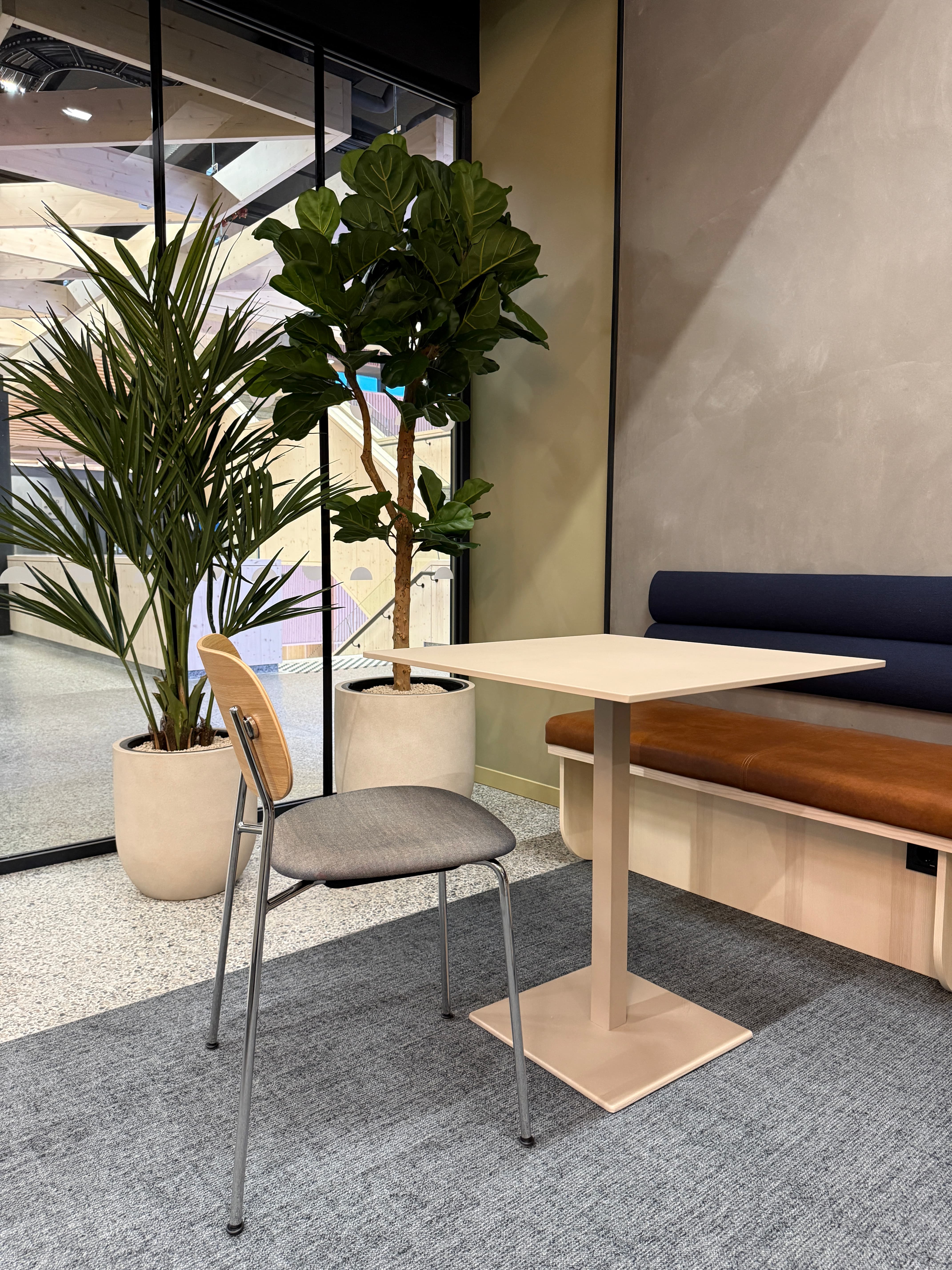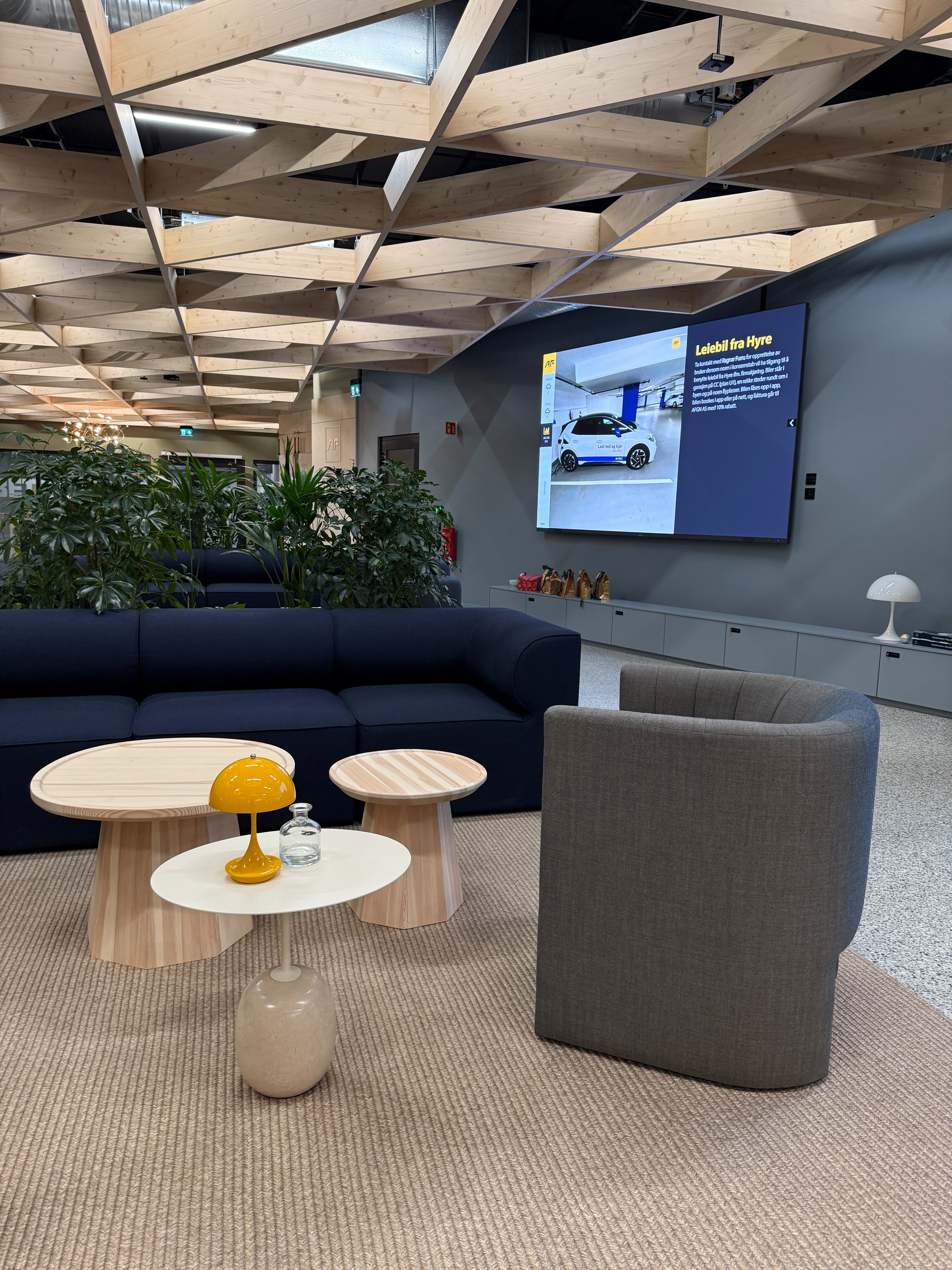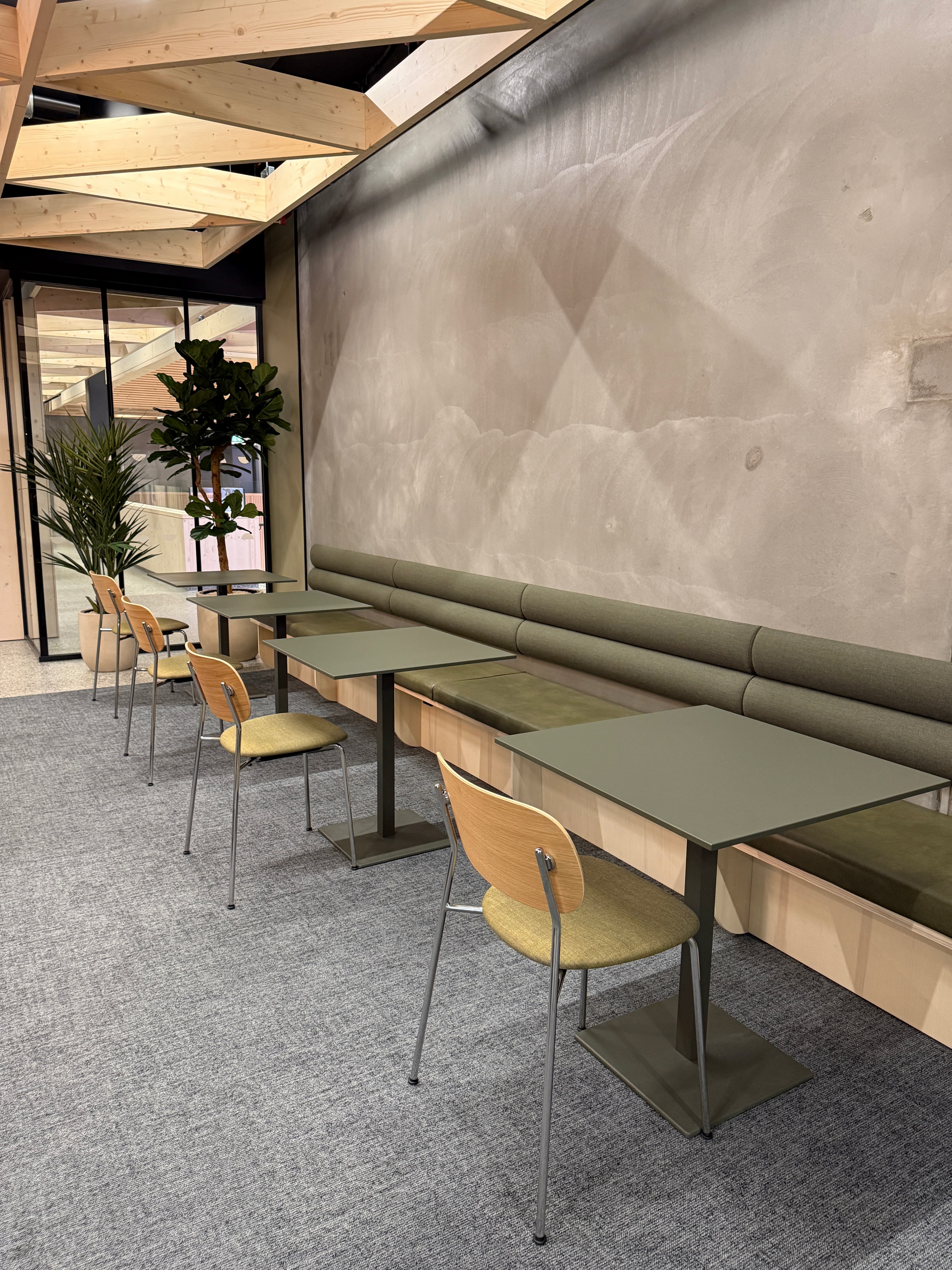 Møbleringen legger til rette for fleksibel bruk og naturlige møtepunkter gjennom dagen, samtidig som de understøtter selskapets verdier og identitet. Etasjetorgene er differensiert gjennom egne former og farger inspirert av enhetene i de ulike etasjene: