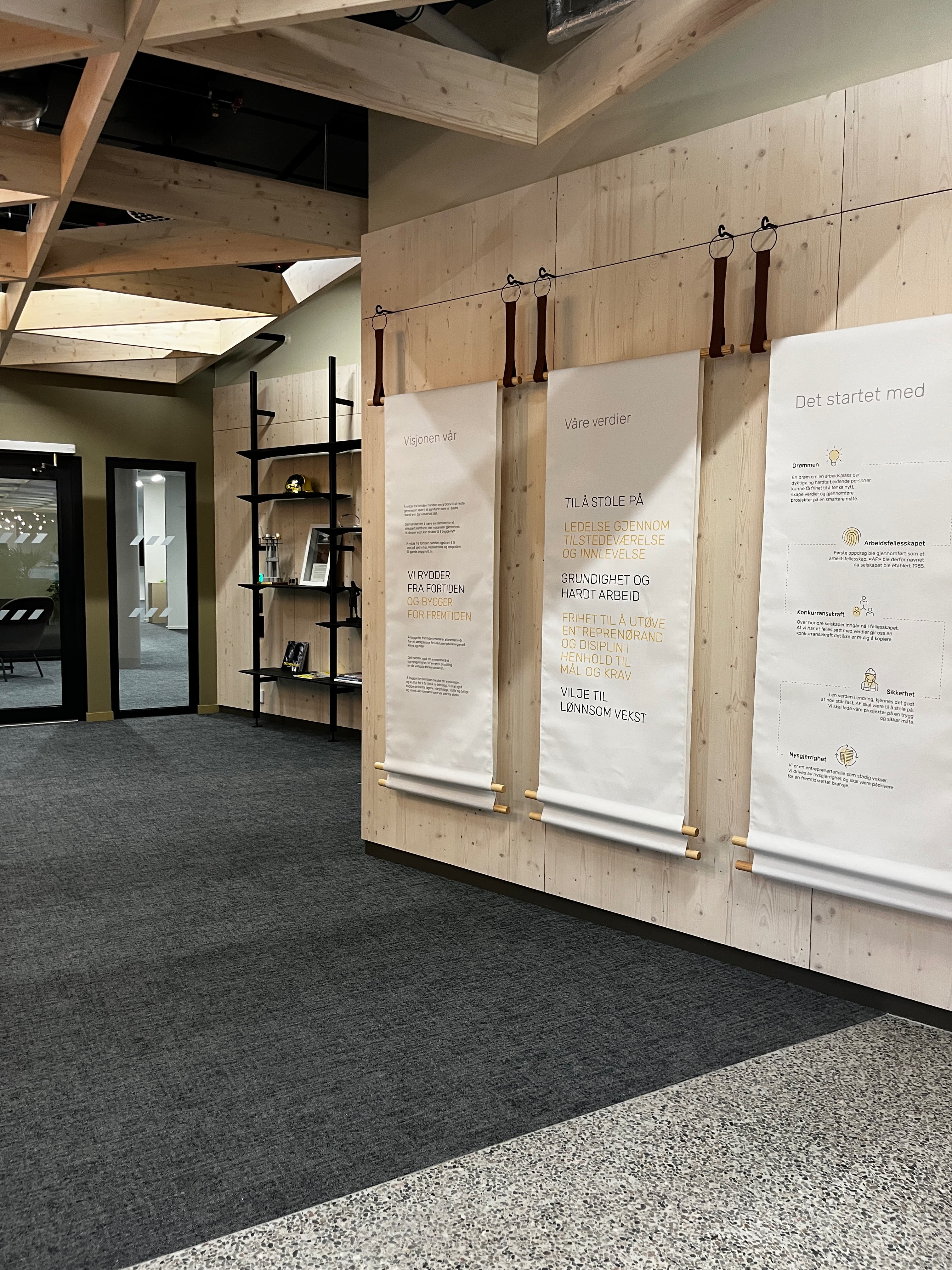 Interiørkonseptet for AF Gruppen er også inspirert av selskapets historie, verdier og nordiske tilhørighet, satt inn i en fremtidsrettet ramme der bærekraftige løsninger står sentralt. Hos AF Gruppen er det valgt en robust og ærlig materialpalett som tåler bruk som står seg over tid. Myke, organiske former, naturlige materialer og en lun atmosfære skaper funksjonelle og inviterende soner som støtter både konsentrasjon, uformelle møter og faglige samtaler, som bidrar til et inspirerende og hjemlig arbeidsmiljø.