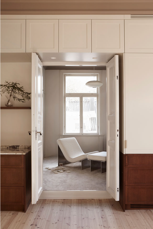 Ved prosjektets begynnelse var mye av den arkitektoniske arven skjult eller fjernet, og romløsningen bar preg av tilfeldige valg. Med en respektfull tilnærming analyserte Scenario hvordan leilighetens opprinnelige kvaliteter kunne gjenoppdages, samtidig som dagens behov ble ivaretatt. I tett dialog med eierne ble det besluttet å gjenåpne dør-partier og restaurere tidstypiske detaljer for å gjenskape leilighetens autentiske karakter.
